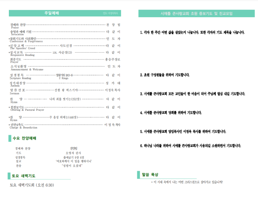 | • 예/결산 제직회 (오늘) 2부 예배 후 [본당] • 3월 정기당회 (오늘) • 초원별 중보기도 및 친교모임 (오늘) 12:30pm [각 초원방] • 초원장 모임 (오늘) 1:30pm [새가족부실] • 서북노회 봄 정기노회 (3/7) [안디옥장로교회] • 예/결산 공동의회 (3/10) 2부 예배 후 [본당] • 초원 성경공부 (3/10) 12:30pm [각 초원방] |